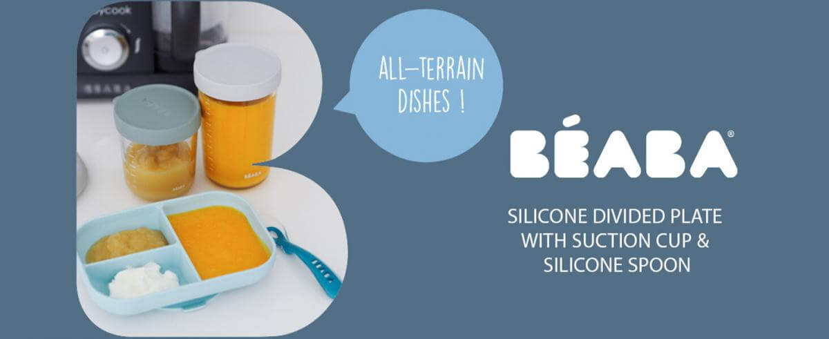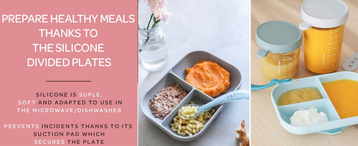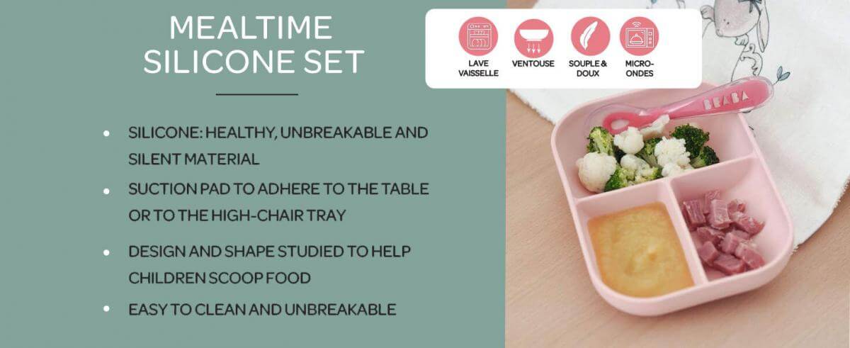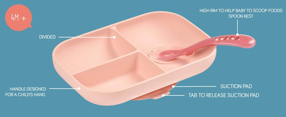 - 2-piece set includes: silicone divided plate and 2nd stage silicone spoon