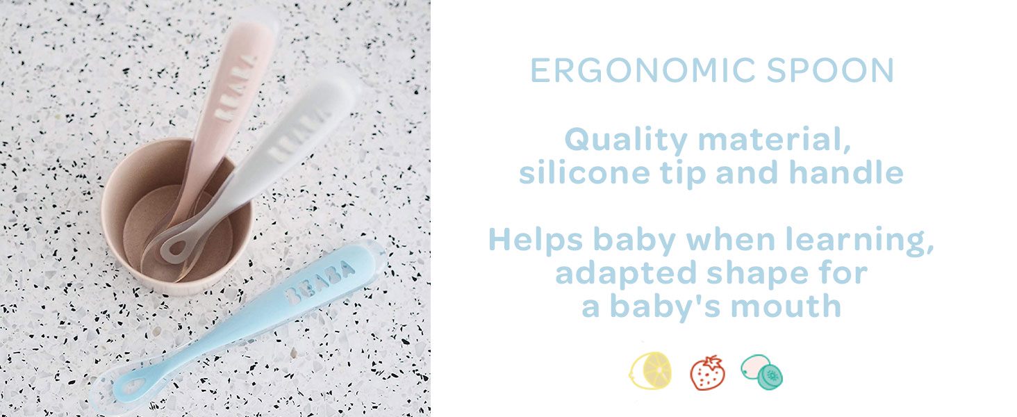 Ergonomic and perfect for guiding your baby through their first food discoveries, this spoon is designed for early feeding when adults are feeding the baby. The ultra-soft silicone tip eases the transition, providing optimal gentleness for your baby's sensitive gums. Its flexibility eliminates any risk of injury, ensuring a pleasant and safe feeding experience for your child. The spoon's shallow design prevents overloading, making it easier for the baby. Featuring a long, ergonomic handle, this spoon is perfectly suited for an adult's hand. It's length is ideal for reaching all types of jars, offering great practicality.